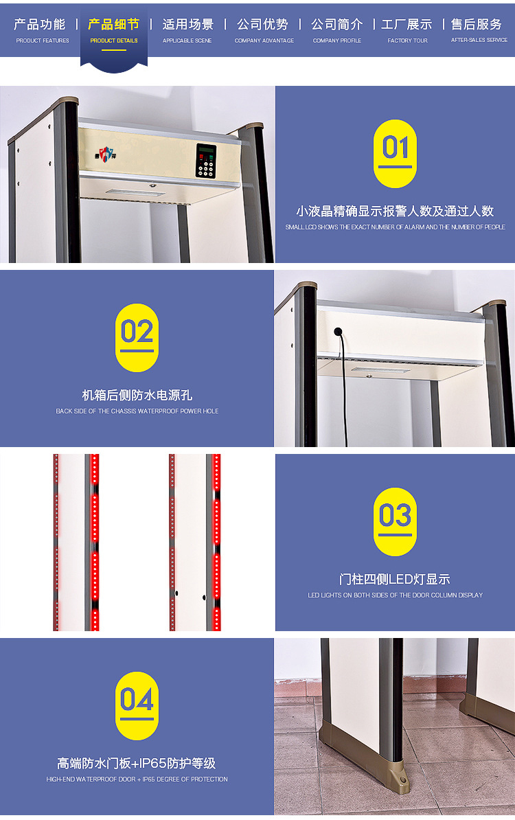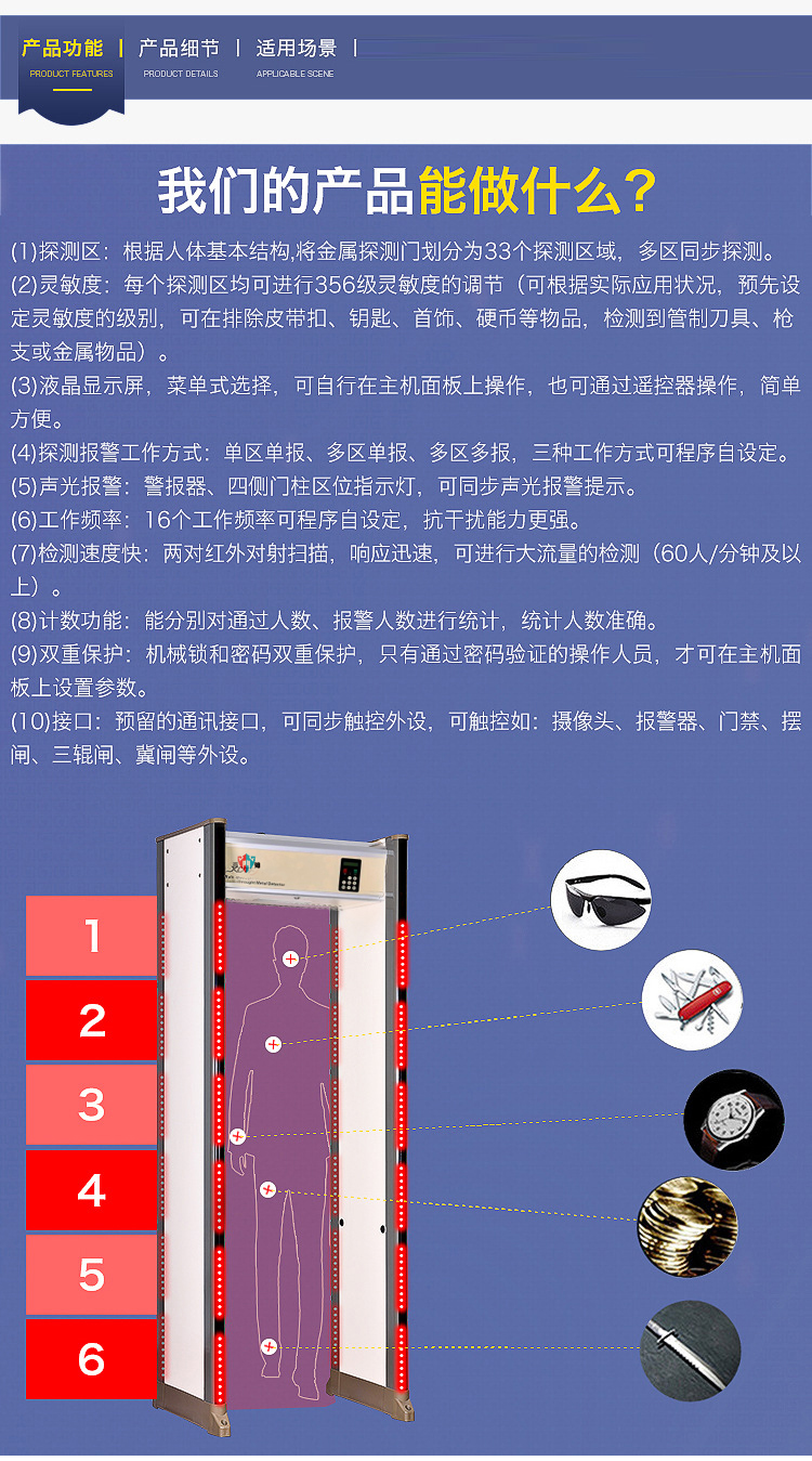(1)、探測區:根據人體基本結構,將金屬探測門劃分為33個探測區域,多區同步探測。