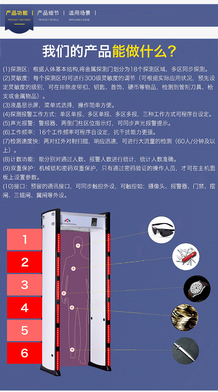 (1)、探測區:根據人體基本結構,將金屬探測門劃分為22個探測區域,多區同步探測。