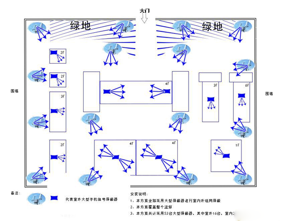由上圖可以看出,采用新型智慧型屏蔽器,僅需4臺即可完成整個區(qū)域的無縫屏蔽,基于智慧型屏蔽的工作原理,不受周邊運(yùn)營商基站信號的影響可以做到無縫無死角嚴(yán)格屏蔽。