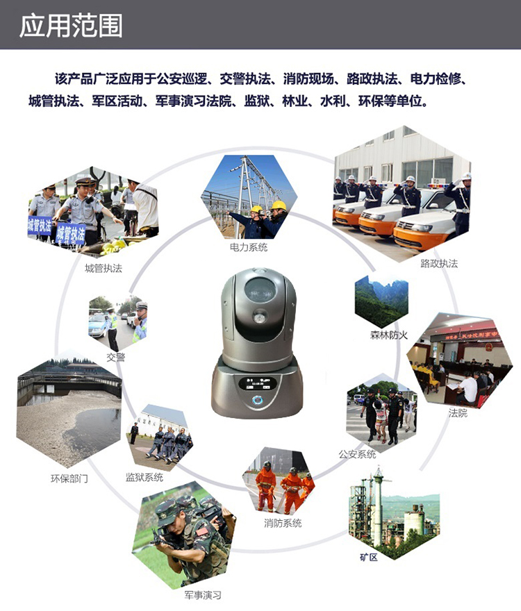 執(zhí)行任務時可快速將設備臨時安放在需要監(jiān)控的位置或直接吸附在車輛上,任務結束時可方便將設備拆下,適用于外勤執(zhí)法、偵查布控、安防安保、應急指揮、搶險搶修、巡線管理等行業(yè)應用,比如公安、交警、消防、路政、城管、交通、法院、監(jiān)獄、林業(yè)、電力、水利、環(huán)保等單位。