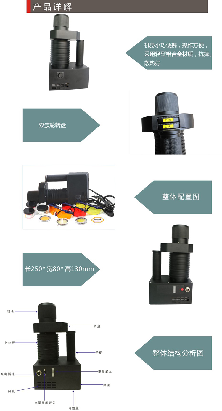 KMS-BA 手持式十三波段光源采用一體化設計,主機內置大容量電池組及段質增透膜濾光片,雙波輪轉盤,機身小巧便攜,操作方便,采用輕型鋁合金材質,抗摔、散熱好。直流供電,可以選配備用鋰電池組,延長了沒有220V交流電工作時間,達160分鐘以上,余電顯示。 55W高亮度HID氙燈,燈泡壽命長,是理想的現場勘察設備。